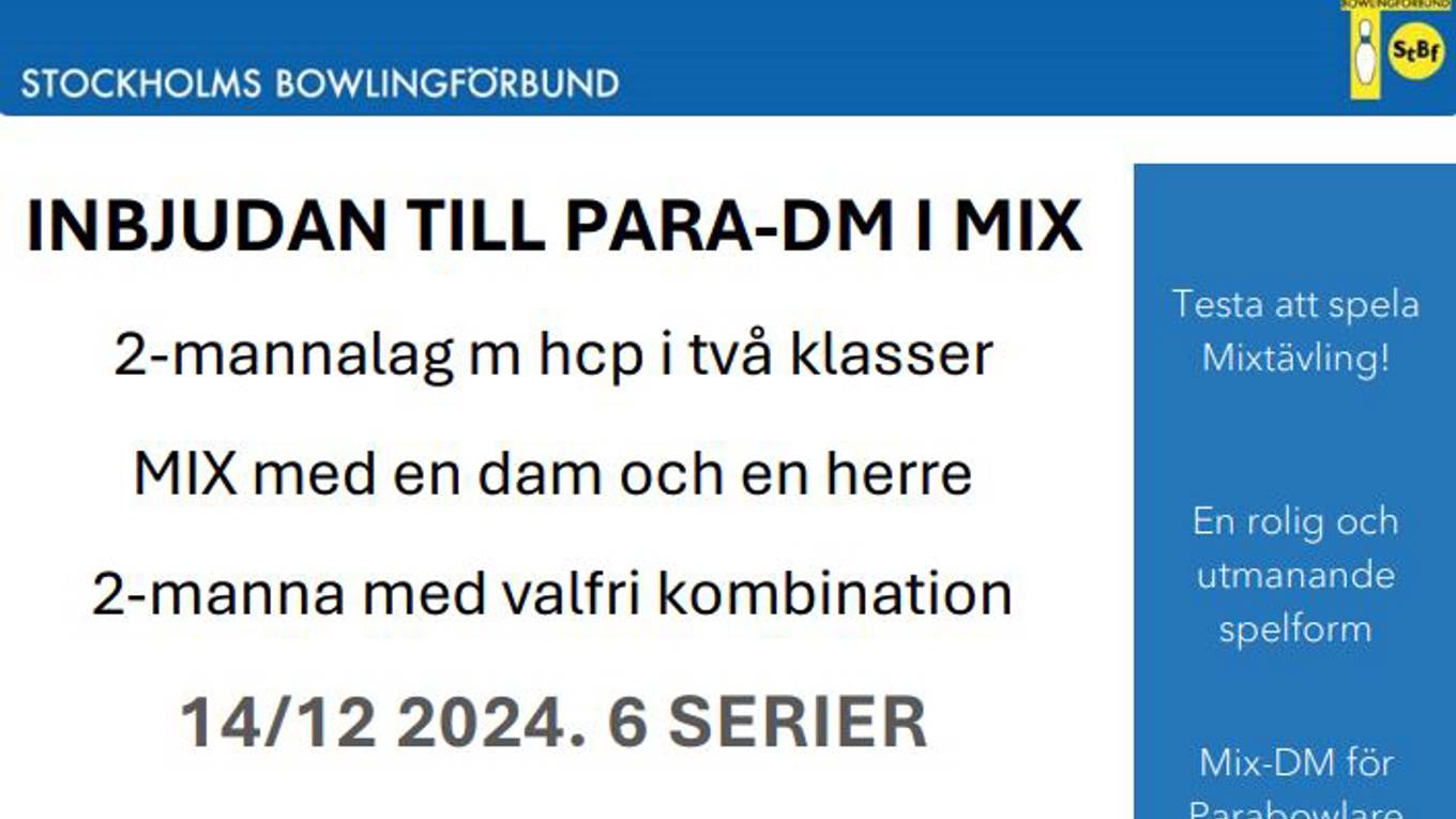 Stockholms Bowlingförbund tillsammans med New Bowl Center Gullmarsplan bjuder in till Para Mix DM.